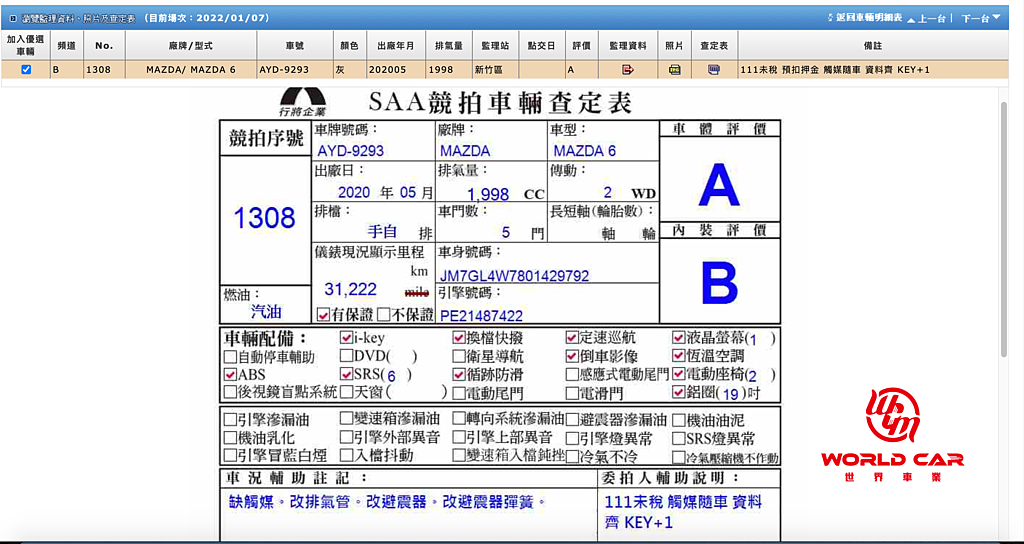每一部進入行將拍賣的車輛都必須由專業的技師檢查後給予查定表。
